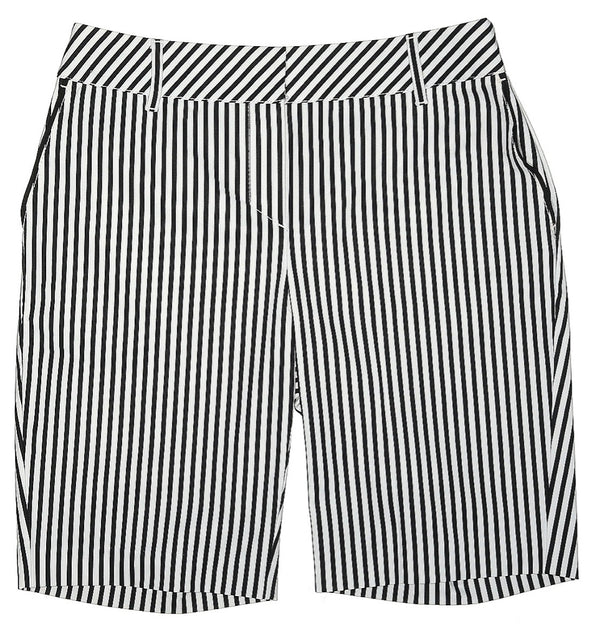 Description : Annika by Cutter & Buck Black and White Striped Shorts with 2 Front Pockets, 1 Back Pocket, Belt Loops, Zipper Fly, and Clasp; 60% Polyester, 40% Sorona; 10" in-seam; Size 6