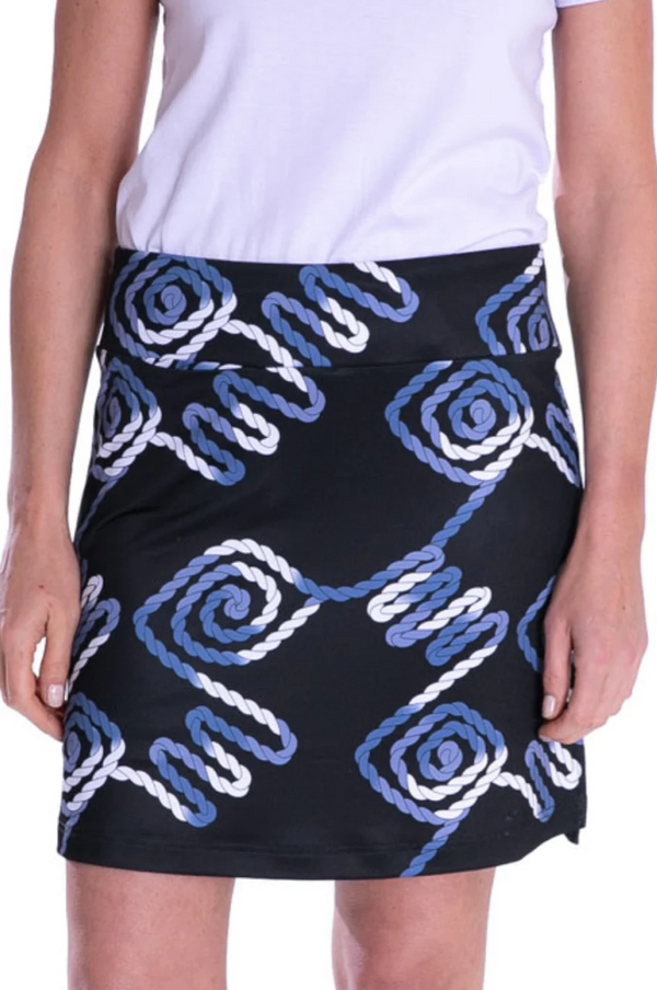 Description : Blue and White Braided Pattern Pull-on Style 1 front and 1 back pocket 15" Length 95% Polyester, 5% Spandex