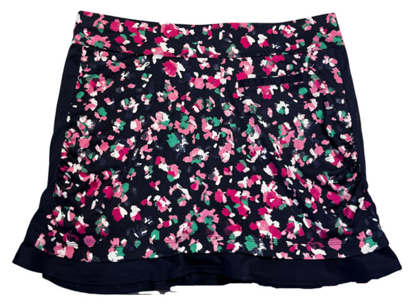Description : Navy blue along the sides and ruffles at the bottom 1 back right pocket 16.5" length 100% Polyester